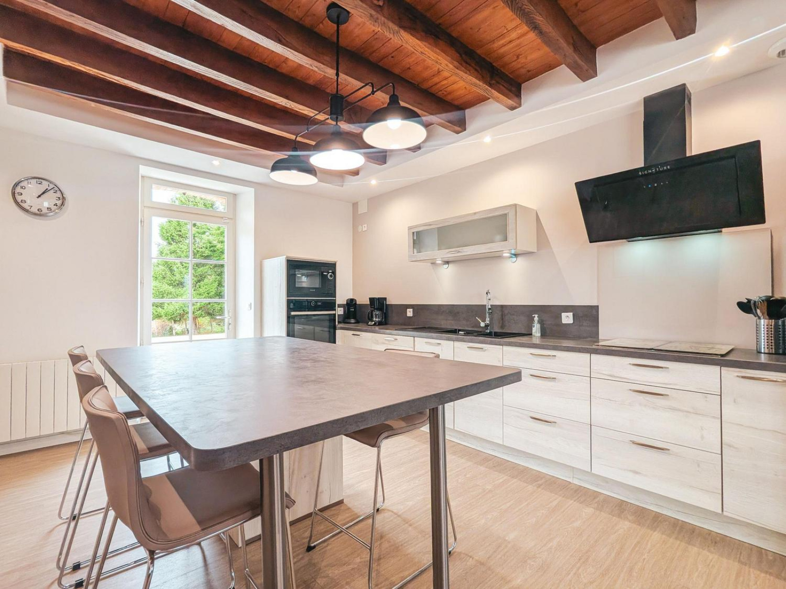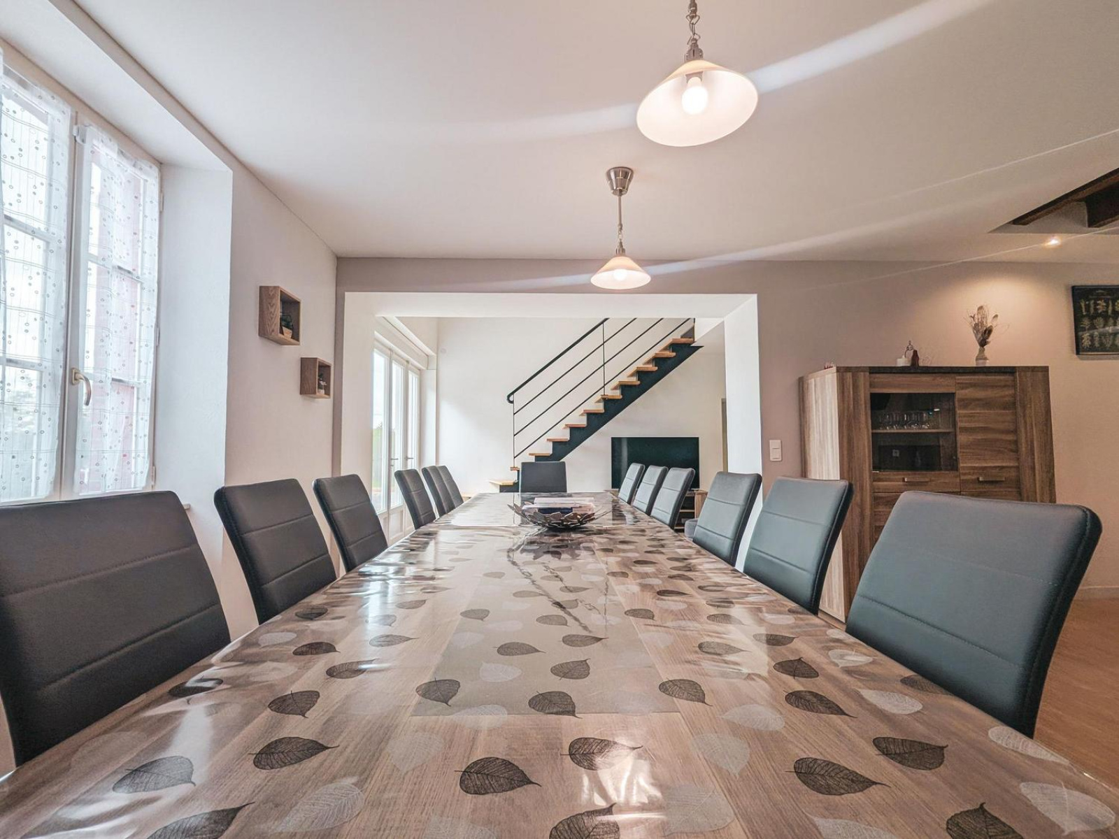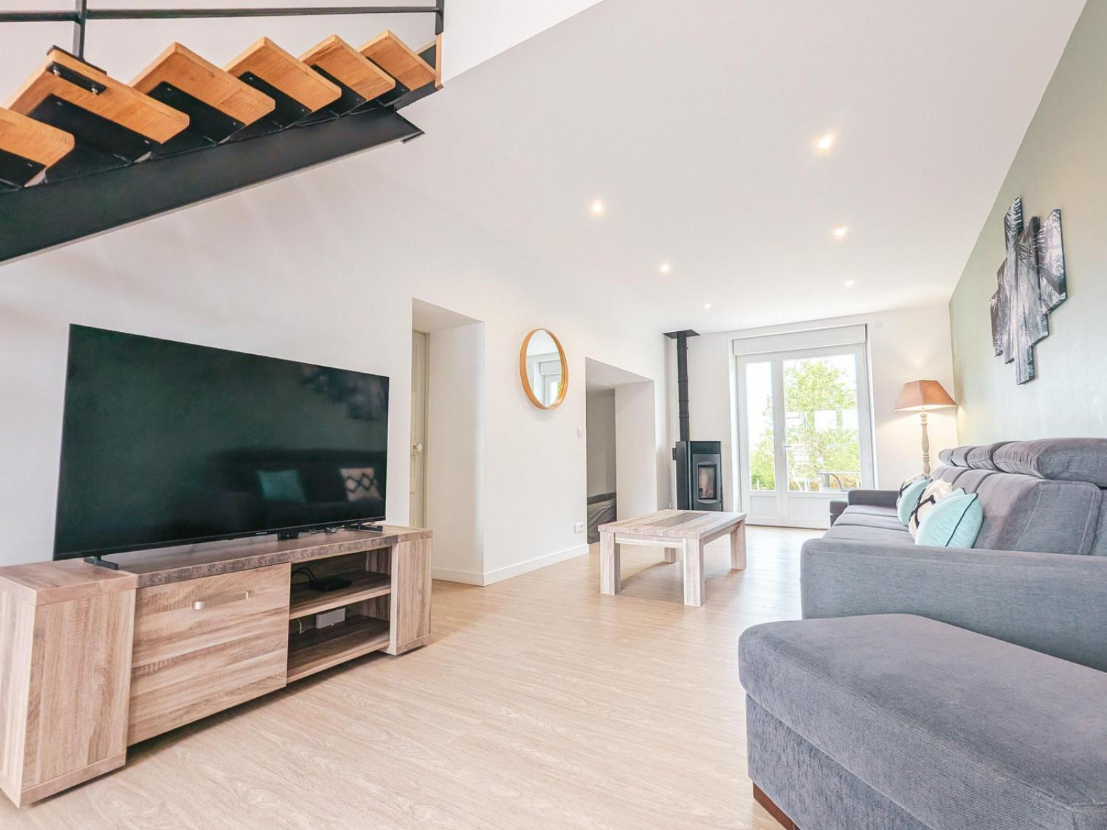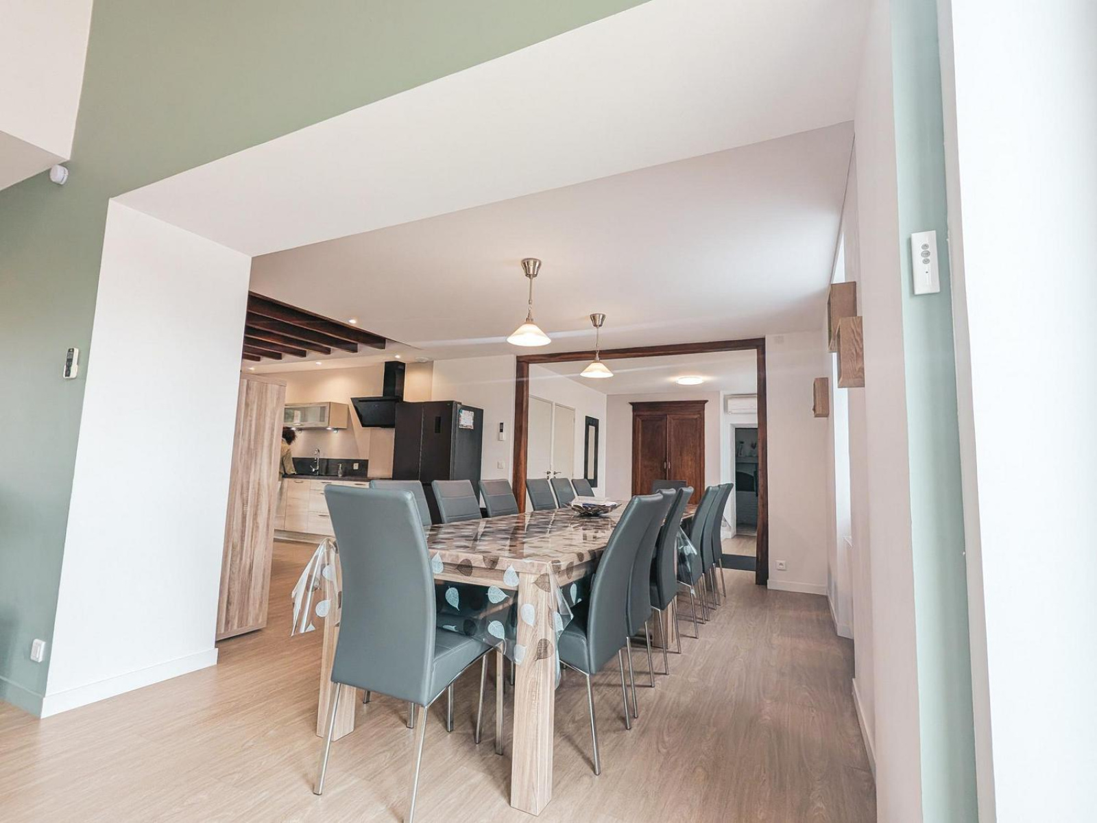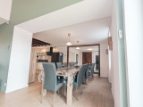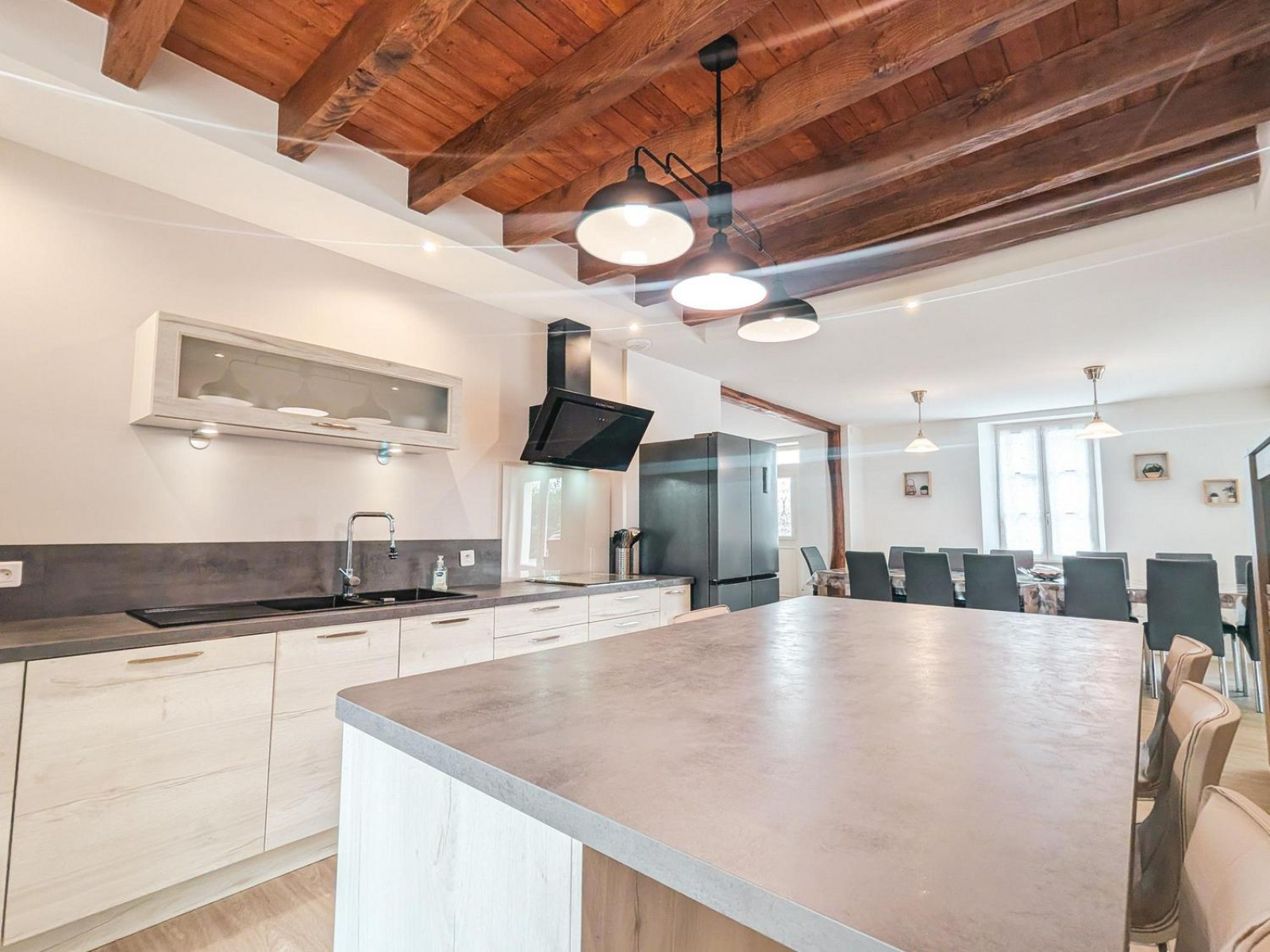 La pièce de vie de plus de 70 m² regroupe un vaste salon, une salle à manger et une cuisine ouverte contemporaine, créant un espace convivial et chaleureux.